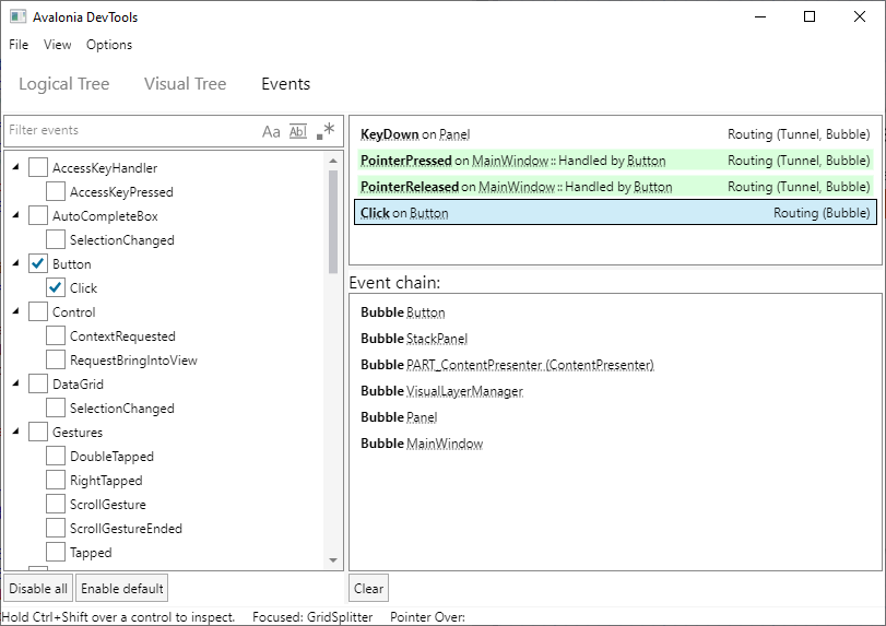 An essential part of application functionality management performed by Avalonia UI, is the generation and propagation of events. The Events tab logs the source and propagation of events as you move around, and otherwise interact with the running application.