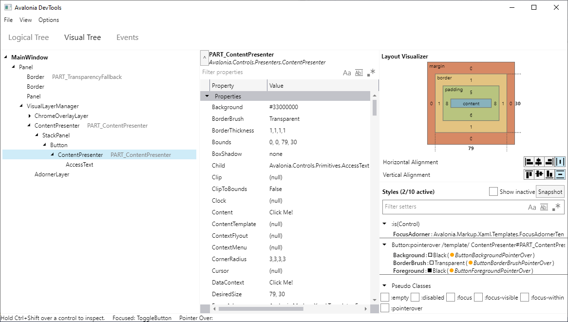 The visual control tree contains everything that is actually being run by Avalonia UI. It shows all the properties set on the controls, and all the additional parts that have been added by Avalonia UI in order to present the UI and manage the application functionality.