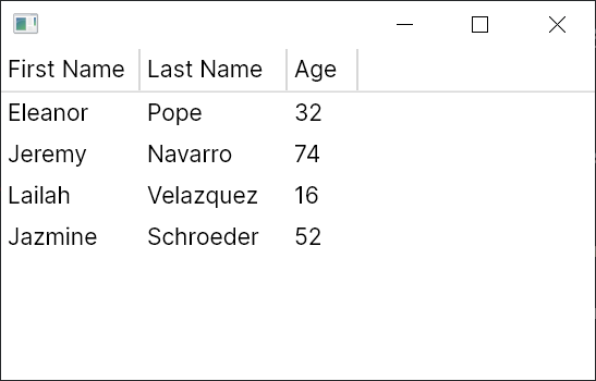 Because we're displaying non-hierarchical data, we'll use a FlatTreeDataGridSource<Person>. FlatTreeDataGridSource is a generic class where the type parameter represents the data model type, in this case Person.